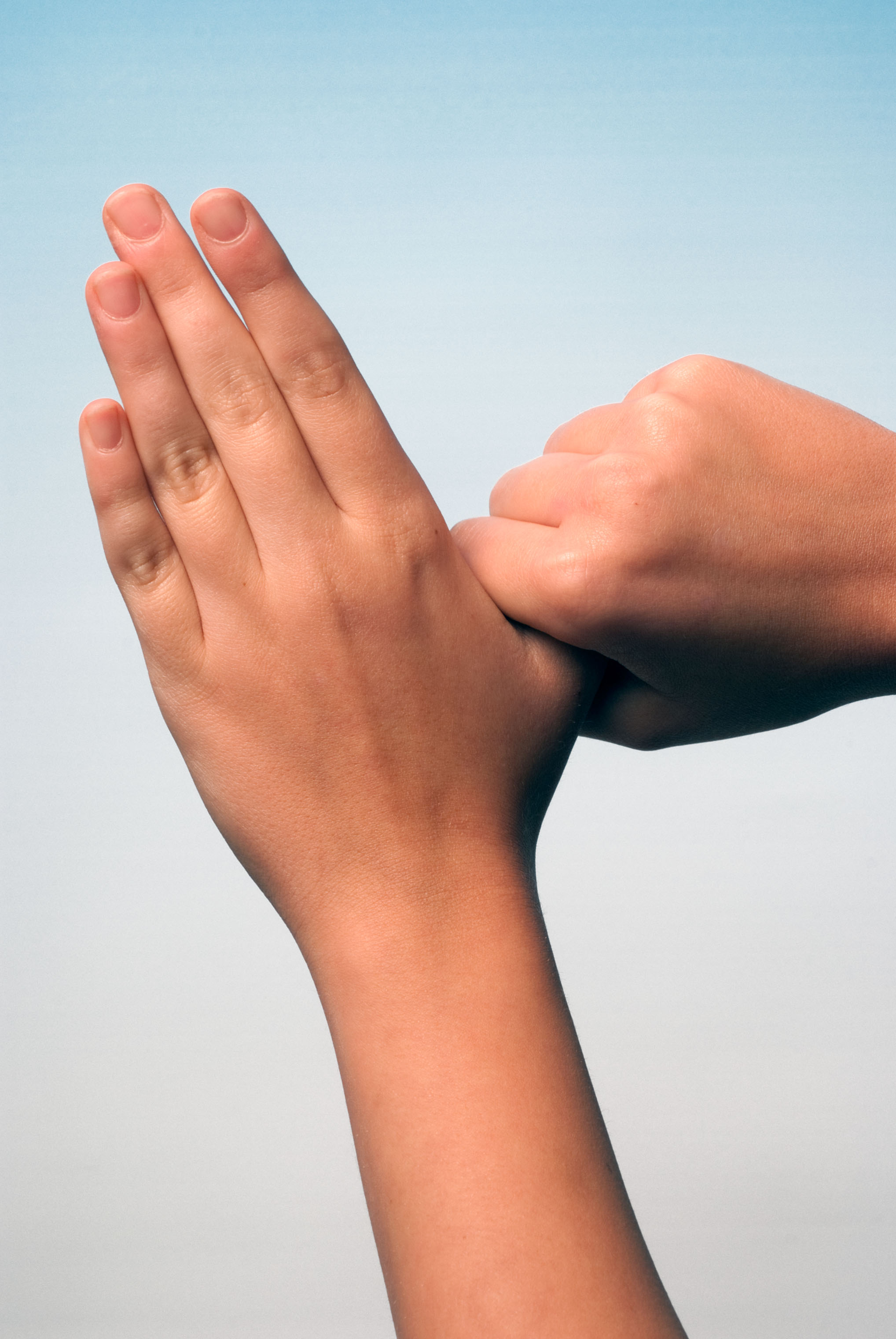 2. Rechte Handfläche über linkem Handrücken und umgekehrt kreisend bewegen.