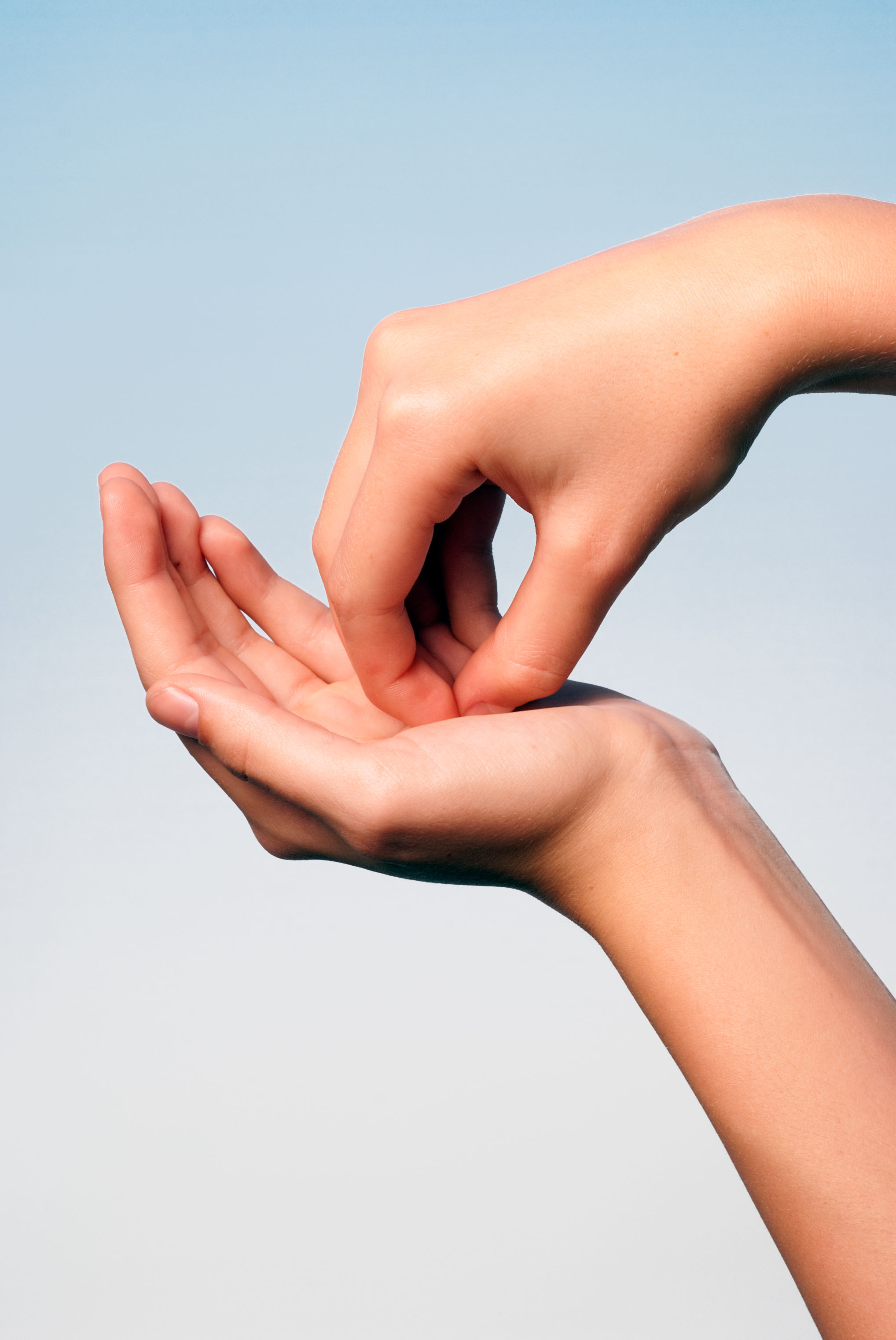 1. Min. 3 ml Desinfektionsmittel in die trockene hohle Handfläche geben. Handfläche auf Handfläche legen und gegeneinander reiben. Handgelenke nicht vergessen.